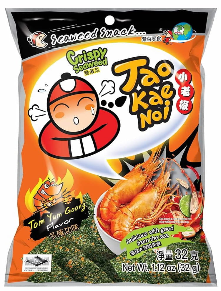 Chrupiące algi morskie w unikalnym tajskim wydaniu! Tao Kae Noi łączy delikatne płatki prażonych wodorostów z kultowym smakiem Tom Yum Goong – aromatycznej, lekko kwaśnej i pikantnej zupy krewetkowej. To połączenie chrupkości i intensywnej przyprawowej nuty przenosi prosto do serca Tajlandii.
